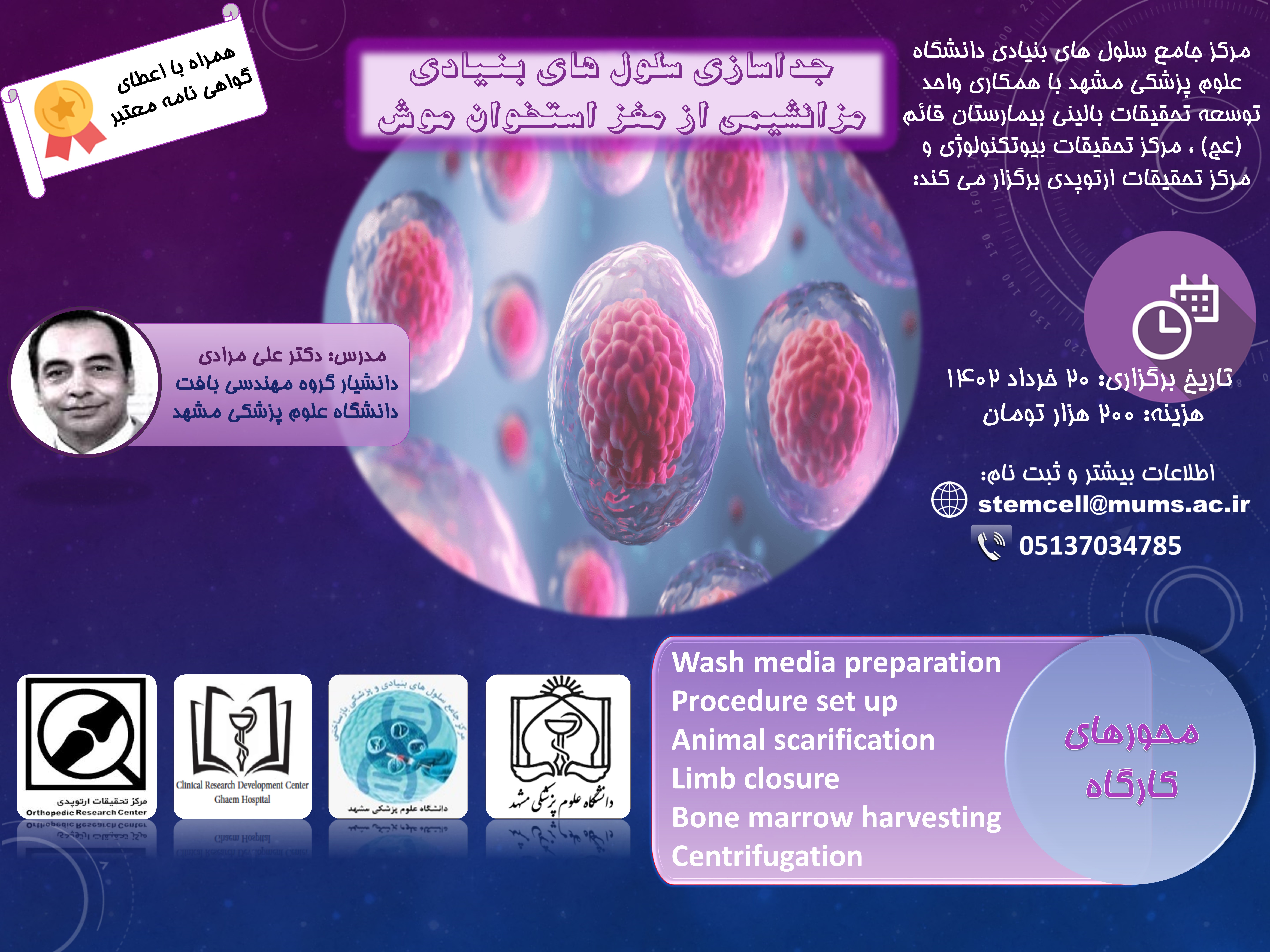 علاقهمندان به شرکت در این کارگاه برای کسب اطلاعات بیشتر و ثبتنام، میتوانند با خانم نسترن بانی، کارشناس مرکز جامع سلولهای بنیادی دانشگاه با شمارهتلفن 05137034785 تماس حاصل نمایند.